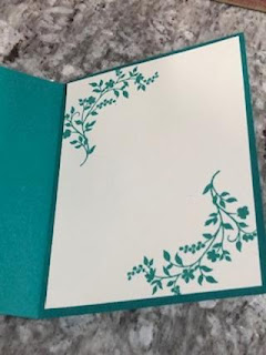 Stamp the flowering vine stamp on both Whisper White pieces of paper. On the small piece of card stock stamp so that the ends of the vines are going towards the middle of the paper. It doesn't matter if they overlap because they will be covered with the sentiment matte. The inside card stock can be stamped more in the corners leaving room to write.